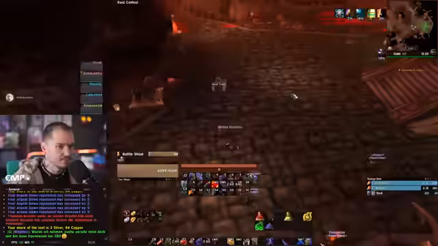 09:23:33Während der Gruppe durch die Gänge von BRD reist, findet eine weitere Truhe und ein Zugang zur Brücke. Der Streamer erwähnt, dass er einen Cloak bekommen hätte, wenn er nicht ausgeschlossen gewesen wäre, was ihn aber auf seinen Hit-Wert aufmerksam macht. Die Gruppe bespricht die benötigten Quest-Items und den bevorstehenden Gang zu Magister's Terrace und dem Kassettierer.