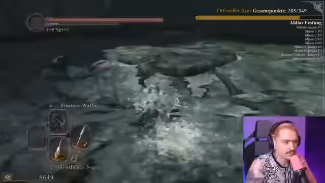 04:15:09Auf dem Weg zum Dark Lurker in der Schwarzen Schlucht wird der Weg als gefährlich und unergründlich beschrieben. Im Kampf gegen Havel the Rock entscheidet sich der Streamer für einen Parry-Versuch, der fehlschlägt. In der nachfolgenden Panik wird der Tod eingeleitet. Der Run endet vorzeitig, und der Streamer analysiert seinen Fehler, der auf zu wenig Erfahrung mit Parry in DS2 zurückzuführen ist. Die Zufriedenheit über den erreichten Stand ist trotzdem vorhanden.