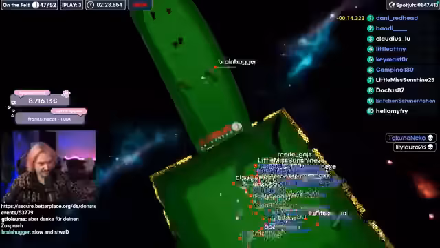 01:47:11Während des Streams wird eine Spendenaktion für das Berliner Tierheim inszeniert. Der Streamer kündigt an, dass Chat-Mitglieder für 5 Euro spenden können und ihm dann vorschlagen können, welches Tier er im nächsten Spiel spielt. Das Geld fließt an das Berliner Tierheim und die Berliner Tiertafel. Immer wieder werden während des Streams Spenden von verschiedenen Viewern genannt, wobei die Höhe der Beträge variiert, von 25 bis 75 Euro.