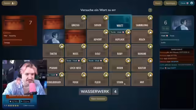 00:59:10Die Rollen wechseln, und der Streamer übernimmt die Rolle des Hinweisgebers. Er muss nun die Wörter für sein Team finden und denkt über Wortverbindungen für "Nerv" und "Kanal" (z.B. "Wurzel") oder "Punkt" und "Pfeilchen" (z.B. "Boxen") nach. Das Spiel gestaltet sich schwierig, da er Wörter wie "Nürnberg" und "Elf" kaum zuordnen kann. Er hofft, dass sein Team später bei offensichtlichen Verbindungen wie "Gold" und "Brett" im Boxkampf-Kontext mitzieht.
