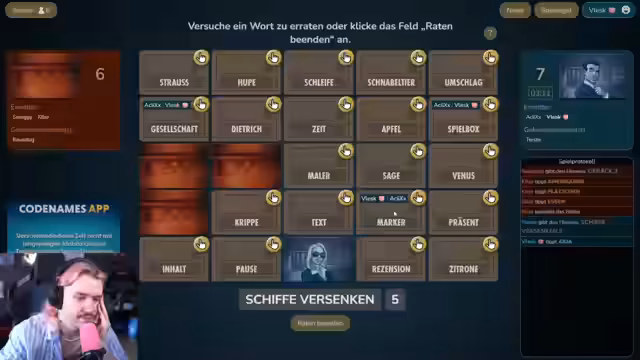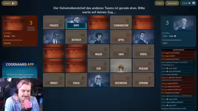 00:37:35Das Spiel von "Codenames" wird fortgesetzt und die Wortverbindungen werden intensiv analysiert. Smaggy gibt einen Hinweis "Heidelberger", worauf der Streamer versucht, die Wörter wie "Wasserwerk", "Loch Ness", "Horn" oder "Elefant" zu verbinden. Nach anfänglichen Schwierigkeiten, in Smaggys Kopf zu denken, entwickelt er Theorien, wie z.B. ein Berg wie der Mount Everest als "Hut" interpretiert werden könnte, um die Wörter zu lösen.
