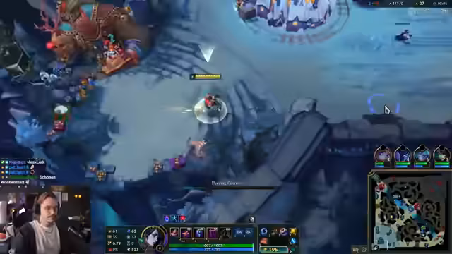 00:24:57Die Teamzusammenstellung und Champion-Picks werden diskutiert, wobei der Streamer Poppy in Betracht zieht. Es wird über die Elo-Verteilung der Spieler spekuliert, da Zenith, ursprünglich als hochrangiger Spieler angekündigt, nicht dabei ist. Two-Stone und Shira werden als Master-Spieler genannt, während Bröki zum Ausgleich dient. Der Streamer selbst bewegt sich zwischen Emerald und Diamond. Die Erfahrungen aus dem letzten Inhouse-Match werden geteilt, wobei Kutscha den Streamer in der Mitte dominiert hat. Bart wird für seine nützlichen Plays gelobt, besonders wenn er nicht Shaco spielt. Die Schlafprobleme des Streamers werden erneut thematisiert, wobei er humorvoll anmerkt, dass League Inhouses und Top-Lane-Spiele alles besser machen. Erste Spielzüge werden besprochen, darunter ein Gank auf Milio und die Platzierung eines Control Wards, um Ginnys Aktionen entgegenzuwirken. Die Kommunikation im Team ist aktiv, mit Anweisungen und Rückmeldungen zu Positionierungen und Fähigkeiten.