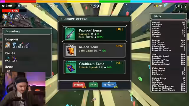 00:04:34Der Streamer diskutiert die Herausforderungen der Spielmechaniken, insbesondere die wechselnde Sprache des Spiels und die Unzuverlässigkeit der Stats während des Runs. Er experimentiert mit verschiedenen Builds, darunter Slutty Rocket und Executioner, und betont die Notwendigkeit, Crit Damage und Projectile Count zu erhöhen. Ohne Luck Tome sei der Run extrem schwierig, da Legendary Items selten droppten, was den Traum vom Rekord erschwere. Er beschreibt Megabonk als Mischung aus Vampire Survivors und Risk of Rain 2.