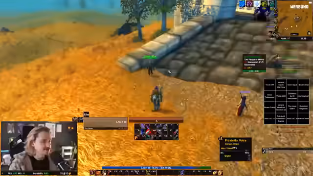 04:11:30Es werden Vorbereitungen für das Gildenmeeting und den geplanten Nachtelfen-Escort von Darnassus nach Sturmwind getroffen. Diskussionen über vergangene Quests und Todeserlebnisse, insbesondere die Herausforderung der Söldner-Elite-Quest (Level 19) bei niedrigen Levels, dominieren die Frühphase. Der Streamer warnt ausdrücklich davor, diese Quest alleine mit Level 15 zu versuchen, da die Gegner stunnen. Zeitgleich plant die Gruppe die Route durch Gebiete mit Level 20-25 Gegnern und diskutiert Logistik wie Ruhesteine und Flugpunkte für schnelle Rückkehrmöglichkeiten bei Todesfällen.