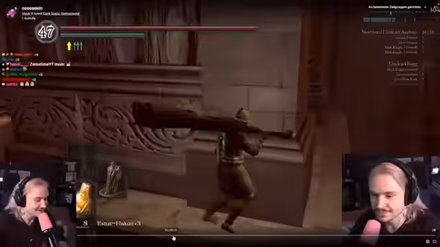 01:02:30Ich habe meine Anspannung und meinen Puls gestanden, da ich direkt in Anor Londo starte. Ich habe mich dafür geschämt, wie vorsichtig ich vorgegangen bin. Ich habe mich über meine Angst vor den Archern geäußert, obwohl ich die Stelle schon tausendmal durchgespielt habe. Ich habe den Raid von Franzi gedankt und ihr mein Beileid für ihren schnellen Tod ausgesprochen. Ich habe mich gefragt, ob ich auch einfach hinten rumlaufen soll, wie sie es getan hat. Ich habe versucht, die Archer zu passieren, bin aber heruntergefallen. Ich habe mich über meinen eigenen Fehler geärgert und mich dafür geschämt. Ich hätte einfach stehen bleiben oder in die Wand rollen können. Ich glaube, dass Maxims Tipp, gerade zu stehen, indirekt zu meinem Tod geführt hat, weil ich zu sehr darauf bedacht war, gerade zu stehen, anstatt in die Wand zu rollen. Ich habe betont, dass Maxim nicht wirklich schuld ist, aber dass sein Tipp mich beeinflusst hat. Ich habe mich gefragt, warum ich nicht durch den Boden phasen konnte.