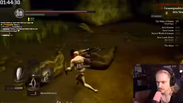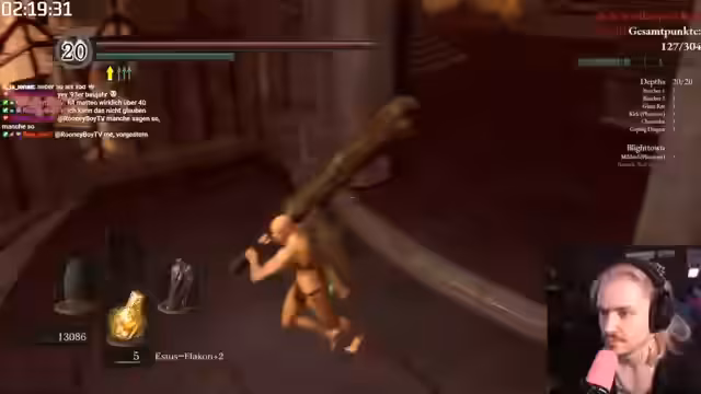 02:18:24Nachdem der Streamer die Blighttown hinter sich gelassen hat und die Quelaag-Schwertkämpferin besiegt hat, macht er sich auf den Weg zu den Ruinen von Ne Londo. Er ignoriert die meisten Gegner, um Zeit zu sparen, und konzentriert sich darauf, die vier Könige zu besiegen. Nachdem er den Wanderfluch erhalten hat, betritt er den Kampf, den er mit Havel und seiner Waffe relativ sicher meistert, und erhält dadurch die große Seele, die er für den Aufstieg benötigt.