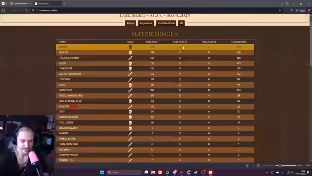 00:14:26Der Streamer analysiert die Todesfälle der anderen Teilnehmer im Soulkeepers-Ranking und vergleicht diese mit seinem eigenen. Er zeigt, wie Holla durch einen Block mit Havel mit zwei Händen tödlich getroffen wurde, und kritisiert eigene Fehler, wie das zu späte Aufsuchen der Bogenschützen. Auch der Tod von Sterzig an Priscilla wird thematisiert, was den Streamer verärgert, da er diesen Fall im Stream vorhergesagt hatte. Die hohen Lebenspunkte einiger Gegner wie Priscilla werden als extrem herausfordernd beschrieben.