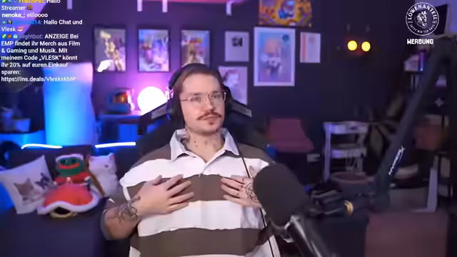 04:23:18Der Streamer stellt Holzkern als Streampartner vor, der handgefertigten Schmuck aus natürlichen Materialien wie Holz und Stein anbietet. Gezeigt werden eine Sonnenbrille (mit Plan zur Umgestaltung in eine Sehbrille), ein Ring und eine Kette. Holzkern wird als Weihnachtsgeschenk-Idee empfohlen, mit Rabattcode Vlesk für Zuschauer. Die Produkte sind einzigartig durch unikate Rohstoffe.
