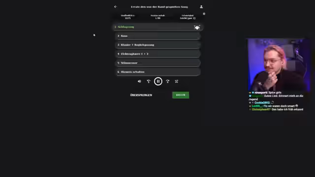 01:51:56Beim Modus 'Hurdle' stößt der Streamer auf erhebliche Schwierigkeiten. Er erkennt Lieder wie 'Modern Girl' von Modern Talking nicht und ist auch bei 'Golden Hour' völlig ratlos. Versuche mit 'Carol of Bells' scheitern ebenso wie weitere Guesses. Bei 'Bandle', einem Rate-Spiel mit isolierten Instrumenten, zeigt er sich überfordert, da er selbst bekannte Songs wie 'Bohemian Rhapsody' oder 'Real Slim Shady' nur am Stimmcover, aber nicht an den reinen Instrumenten erkennt. Dies führt zu erheblichem Frust und einem schwachen Ego.