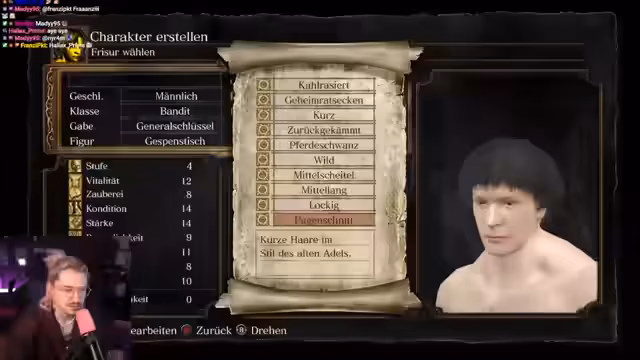00:25:40Ein neues Spiel in Dark Souls 1 wird gestartet, wobei zunächst alte Speicherstände gelöscht werden müssen. Die Entscheidung zwischen den Klassen Krieger und Bandit steht im Raum. Der Bandit startet mit höherer Stärke, während der Ritter mit mehr Vitalität beginnt. Der Bandit wird gewählt, da er insgesamt bessere Stats für den geplanten Spielstil bietet und das Spinschild zu Beginn sehr nützlich ist. Die Startausrüstung und der Generalschlüssel werden ausgewählt, wobei kurz die Überlegung aufkommt, den Generalschlüssel bei zukünftigen Soulkeepers-Events zu verbieten, um das Spiel stärker an bestimmte Zonen zu binden. Die Charaktererstellung wird abgeschlossen, inklusive pinker Haare, und der Testrun unter dem Namen SK Test beginnt. Es wird erwähnt, dass es eine Weile her ist, dass Dark Souls gespielt wurde und die Einstellungen überprüft werden müssen. Die Kameraempfindlichkeit wird angepasst und der Plan für den Run wird umrissen: Zuerst durch das Asylum, dann Richtung Andetburg.