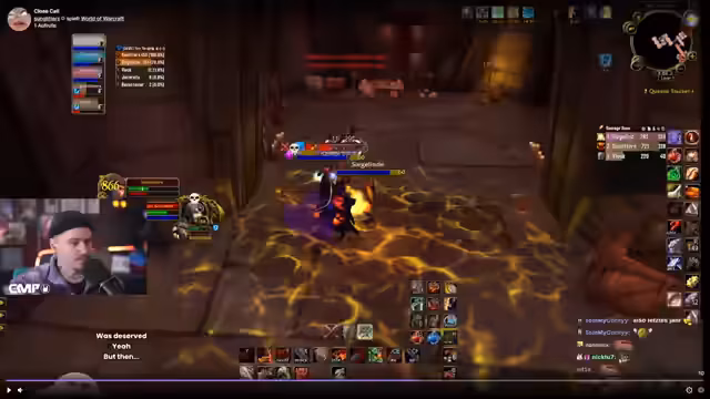 08:53:03Nachdem ein Ork pullen wurde, wird der Fokus auf den Totenkopf, eine Flammenschuppe, gelegt. Es ist wichtig, dass er schnell stirbt, da er sonst eine AOE-Fähigkeit aktiviert, die Schaden an der gesamten Gruppe verursacht. Die Ranges stellen sich in die linke Ecke, die Melees in die rechte Ecke, um den Totenkopf zu töten. Der Streamer kommuniziert ständig die Positionen und Ziele, um einen sauberen Pull zu gewährleisten.