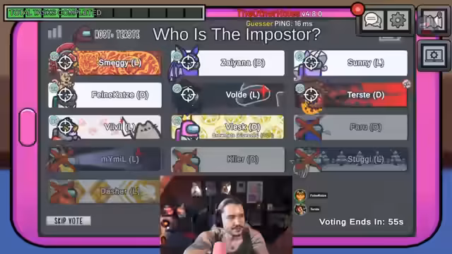 01:04:00In einer der letzten Runden werden die komplexen Rollen-Identitäten schrittweise aufgedeckt. Der Streamer gibt nach anhaltenden Verdächtigungen zu, der Vampir zu sein. Er erklärt sein Vorgehen: Er habe als Vampir gezielt Smaggy getötet und die Situation genutzt, um den Verdacht auf andere zu lenken. Terz, der als Deputy fungierte, greift ihn daraufhin an, was den Streamer provoziert, der dies als 'illegalen Zug' bezeichnet. Trotz des Chaos gewinnen die Crewmates am Ende. Der Streamer resümiert, dass die Runde von unvorhersehbaren Zügen und dem schwierigen Navigieren in den vielen Rollen-Regeln geprägt war.