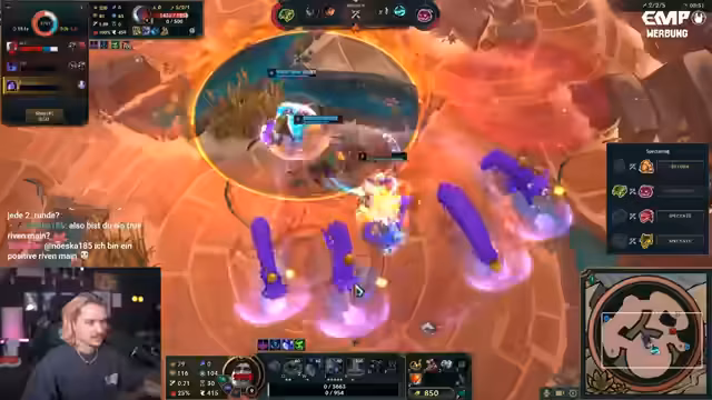 03:40:42Für die folgenden Runden werden die Champions geändert. Der Streamer wählt Riven und plant, aggressiv zu spielen, mit Fokus auf Hard-Engage und Stuns. Die Strategie basiert darauf, den Gegner mit Kombinationen aus Fähigkeiten wie Q-Heal und E-Stun zu überraschen und zu besiegen. Das Ziel ist es, mit einer starken Frontline durchzubrechen und das Spiel zu kontrollieren.