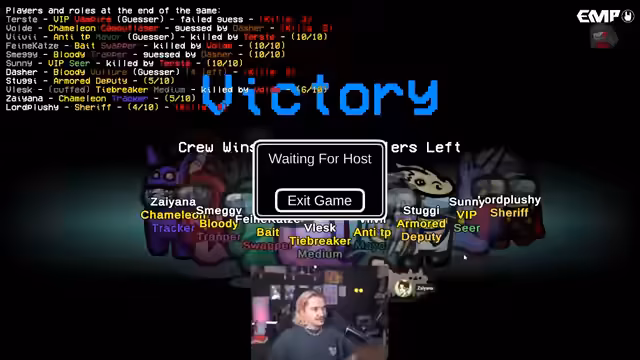 06:48:00Ein plötzlicher technischer Ausfall zwang den Streamer, das Spiel vorzeitig zu beenden. Der Stream selbst ging für kurze Zeit offline, was sich als Twitch-Problem herausstellte, da das Spiel bei anderen Zuschauern noch lief. Trotz des Abbruchs analysierten die Spieler die letzte Runde noch, in der sie 'Volde' als Imposten identifiziert hatten.