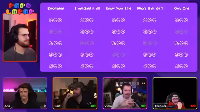 00:34:04Das Quiz beginnt mit der Kategorie "Emojis", bei der die Teilnehmer Serientitel erraten müssen. Die Fragen reichen von offensichtlich bis knifflig, und die Teilnehmer zeigen unterschiedliche Stärken. Während einige Fragen schnell gelöst werden, führen andere zu intensiven Diskussionen und Rateversuchen. Der Streamer moderiert das Spiel, gibt nach jeder Antwort Feedback und bereitet die nächste Frage vor. Es werden Punkte vergeben und abgezogen, was zu einem spannenden Wettbewerb führt.