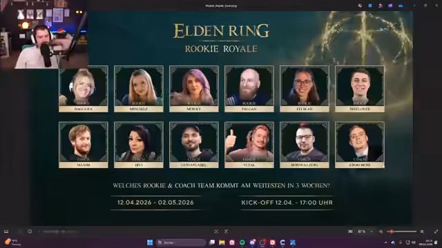 02:26:53Der Streamer wechselt das Thema und plant ein besonderes Event. Er kündigt ein "Elden Ring Anfänger-Turnier" an, bei dem er als Coach teilnehmen wird. Er stellt die Teilnehmer und Coaches vor und diskutiert, mit welchem "Rookie" er am liebsten zusammenarbeiten würde. Er äußert seine Freude an der Idee und erklärt, dass er sich intensiv auf Elden Ring vorbereiten muss, um seinen Anfänger bestmöglich zu coachen. Das Event soll am 12. April stattfinden und wird von Nagura ausgerichtet.