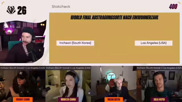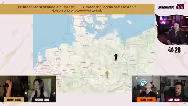 01:00:50Die Schwierigkeit der Fragen steigt in der Kategorie 'Ordnen 400'. Die Teilnehmer müssen fünf Profispieler (Caps, Reckless, Xpeke, Yellowstar, Yike) nach der Anzahl ihrer LEC-Titel ordnen. Diese Frage erweist sich als komplex, da die Daten nicht allen geläufig sind. Tunny sammelt mit drei korrekten Platzierungen die meisten Punkte. Die 'Kartenkunde 400'-Frage verlangt, das Austragungsland von First Stand des Vorjahrs (Südkorea) auf einer Weltkarte zu markieren. Alle Teilnehmer landen nah am Ziel, Nicoletta wäre am nächsten gewesen, jedoch zählt nur das korrekte Land, weshalb alle außer Tunny punkten.