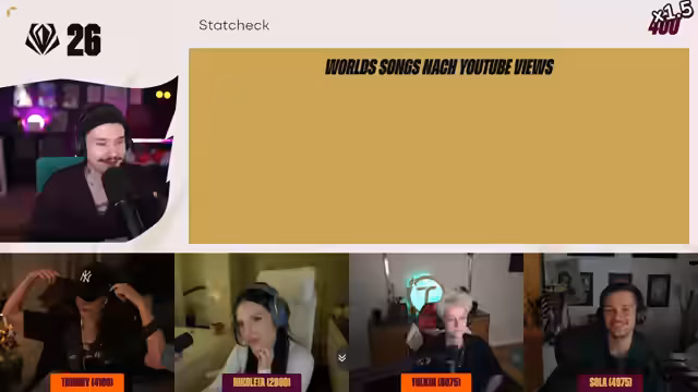 03:12:45Nach der Champ-Select-Challenge wird das Stat-Check-Spiel erneut aufgenommen, diesmal mit dem Fokus auf die Präsenz von Champions in First-End 2025. Die Teilnehmer müssen erraten, welcher Champion, Aatrox oder Renekton, in mehr Spielen gespielt wurde. Zudem gibt es eine neue Schätzfrage, bei der die Teilnehmer den Champion erraten müssen, der im professionellen Spiel die meisten Pentakills erzielt hat. Die Antworten variieren stark, und Tolkien schafft es mit seiner Antwort, die meisten Punkte zu holen.