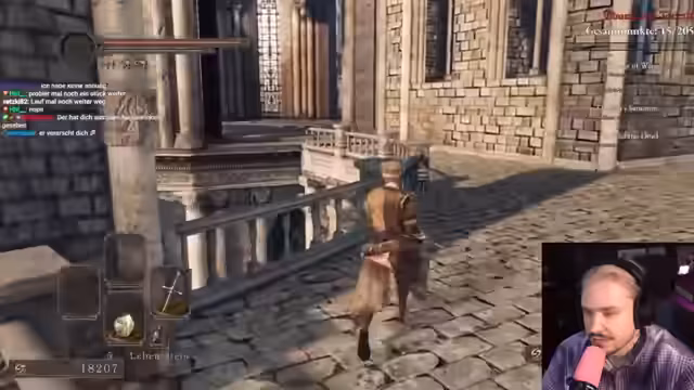 01:21:40Der Streamer beschreibt seine anfängliche Erfahrung mit dem Laufen in Dark Souls 2, das sich merkwürdig anfühlt, da der Charakter erst ein Stück sprintet. Er erkundet die Gegend, trifft auf Gegner wie einen Riesen und ein Nilpferd, und zeigt Interesse an Sammlbaren Items wie Seelen und Scherben. Dabei diskutiert er über Angriffsmöglichkeiten und die Grenzen seines Charakters, insbesondere dass er noch nicht Power Stancen kann und seine Rolle suboptimal ist.