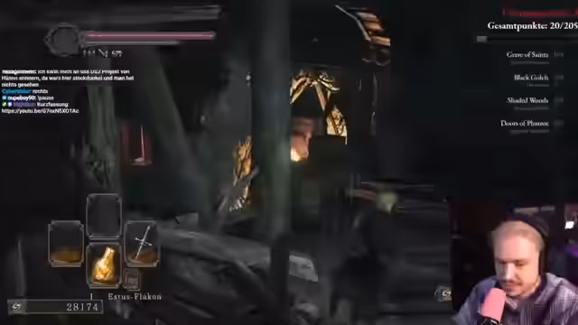 03:53:20Nach dem Kampf muss der Streamer sich neu orientieren und sucht nach dem nächsten Ziel. Er stellt fest, dass sich seine Kamera unerwartet verhält und als 'kaputt' beschreibt. Gleichzeitig überlegt er, ob er Dark Souls 2 im Original oder in der SOTFS-Version spielt. Da er bisher keine Bosse besiegt hat, beschließt er, im Gefängnis weiterzuspielen und Estus zu upgraden. Er sucht auch nach einem Boss, um seinen Run fortzusetzen.