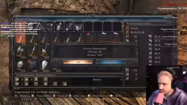 01:15:11Während er das Tutorialgebiet durchquert, trifft der Streamer verschiedene Entscheidungen über Ausrüstung und Items. Er entscheidet sich dazu, bestimmte NPCs nicht zu töten, um deren Ausrüstung zu erhalten, und überlegt, welche Items ihm für den No-Death-Run am meisten helfen würden. Er diskutiert auch mögliche Cheese-Strategien für bestimmte Bosse wie den Dragon Rider und fragt sich, ob solche Methoden im Soulkeepers-Contest erlaubt sein werden.