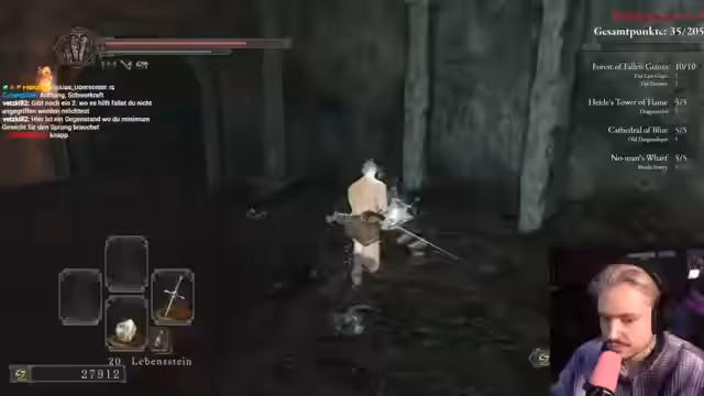 03:55:19Der Streamer erkundet das Gefängnis und sucht nach dem nächsten Boss. Er stellt fest, dass er sich verlaufen hat und hilft sich durch die Kommentare der Zuschauer, den richtigen Weg zu finden. Er trifft auf Pusure-Feinde und muss entscheiden, in welche Richtung er weitergehen soll. Gleichzeitig stellt er fest, dass sein Charakter verflucht ist und seine Lebenspunkte reduziert sind, was die Herausforderung erhöht.