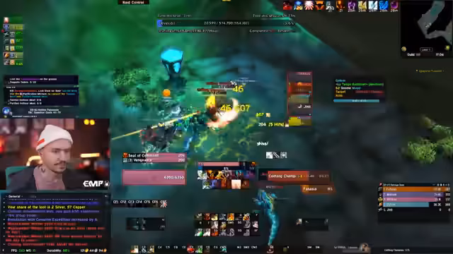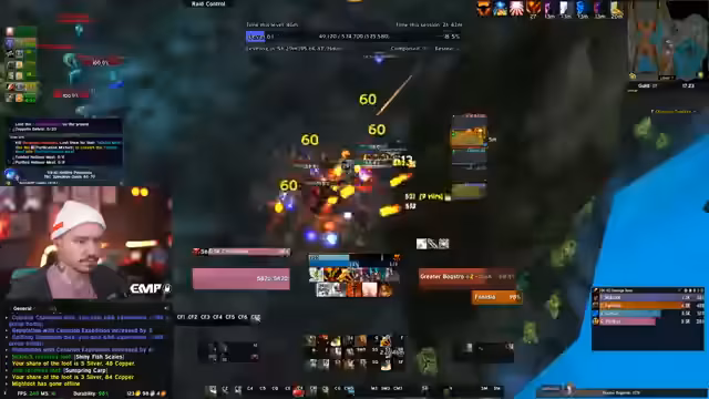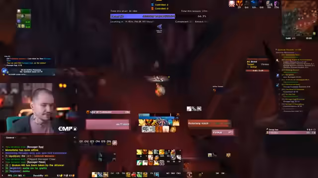00:43:39Die Gruppe startet in den Blood Furnace-Dungeons. Es kommt zu mehreren spannenden Situationen, wie dem plötzlichen Erscheinen von Allianz-Spielern und dem Kampf gegen mehrere Mobs auf einmal. Der Streamer gibt Anweisungen, zeigt sich beeindruckt vom Gameplay und interagiert stark mit dem Chat, der Fragen zu Grafik-Einstellungen und Spielmechaniken stellt, wie zum Beispiel das 'graue HP'-Phänomen.