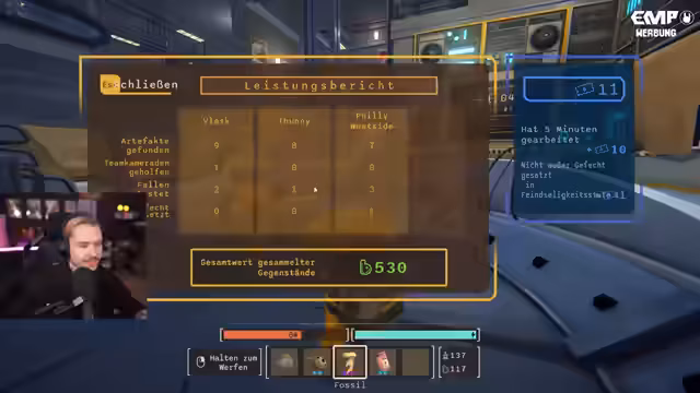 02:39:51Die Spieler starten in Fish Stick Protocol und begegnen sofort einer Fliege, die einen Spieler frisst. Sie versuchen, die Fliege mit Steinen zu bekämpfen, was jedoch nicht effektiv ist. Ein Spieler bemerkt, dass er einen Ausschlag auf dem Kopf hat, weil die Fliege ihn aufgefressen hat. Sie müssen Parcours machen, um an Gegenstände zu gelangen. Mit Shift können sie rennen und weiter springen. Ein Spieler findet eine Ocarina, wirft sie aber versehentlich weg. Es wird festgestellt, dass sie keine Map haben und die Turbulenzen bald kommen, was bedeutet, dass sie abhauen müssen. Das Ziel ist es, das Inventar mit wertvollen Sachen für ihr Anwesen vollzuhauen. Ein Spieler sammelt Steine, die aber wenig wert sind. Sie stoßen auf explodierende Objekte und erleiden Schaden. Ein Spieler ist fast tot und bittet um Hilfe. Sie versuchen, eine Räuberleiter zu machen, um an höher gelegene Gegenstände zu gelangen. Ein Spieler wird abgeschossen und brennt, was Schaden verursacht. Sie finden ein Fernglas und bemerken, dass die Turbulenzen bei 50% sind. Sie sammeln weitere Gegenstände wie Fossilien und Lebensmittel. Ein Spieler gerät in eine Falle und muss befreit werden. Sie begegnen weiteren Fliegen und Sputen. Nachdem sie genügend Gegenstände gesammelt haben, kehren sie zur Basis zurück, wo sie 530 Ansehenspunkte erhalten. Sie müssen die gesammelten Sachen im Anwesen ausstellen, um neue Dinge freizuschalten. Ein Spieler findet Marmelade und eine brillante Pflanze. Sie versuchen, Gegenstände zu kombinieren, um sie krasser aussehen zu lassen, und platzieren Muscheln und Vasen. Es wird festgestellt, dass sie 5000 Punkte benötigen, um in den nächsten Raum zu gelangen, was als „crazy“ empfunden wird. Sie überlegen, wie sie 5000 Punkte bekommen können und beschließen, erneut looten zu gehen. Ein Spieler kann eine neue Map erstellen und legt seine aktuellen Gegenstände im Eingang ab.