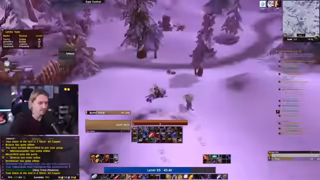 07:50:00Ab 28200 bis 29000 stehen Events und Buffs im Mittelpunkt. Der Streamer erwähnt Onyxia und einen Welt-Event (possibly Dragon Slayer Buff) um 19:08 und 19:35 Uhr. Er plant, 'Songflower' in Felwood zu holen, einen Crit-Buff, und bespricht, wie man World Buffs speichern kann. Es wird über ein mögliches Reden mit Klaus bezüglich eines vollen BRD-Clears gesprochen. Interaktionen mit anderen Spielern wie Toro (der Level 60 erreicht) und Planungen für Gruppenquests werden diskutiert. Der Streamer reflektiert über die Erfahrung von 'Gank' (Moonglade) und den Unterschied zwischen PvP und PvE in Classic.