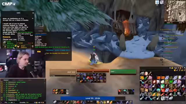 06:02:24Die Gruppe startet den Kampf gegen Prinzessin Theradras, einen Boss im Maraudon. Der Streamer vertraut dem Tank, der auf Level 57 ist, und blickt auf eine negative Erfahrung in einem früheren Kampf zurück, bei dem er kritisch getroffen wurde und gestorben wäre. Er warnt vor der Aggro, die der Boss nach einem Reset auf ihn zieht. Während des Kampfes wird der Chat über das Tastaturgeräusch des Streamers informiert. Nach einem harten Kampf, bei dem der Streamer fast stirbt, kann der Boss besiegt werden. Der Boss droppt einen exzellanten Helm für Magier, was als sehr guter Loot gewertet wird.
