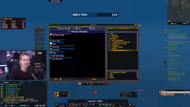 06:11:08Während eines Boss-Kampfes (vermutlich Prinzessin) wird die Taktik besprochen, den Boss seitlich zu manövrieren, um nicht in ein Loch gekickt zu werden. Der Chat und der Streamer analysieren die Loot-Chancen für einen Ring (25%) und eine Krone (20 Intelligenz), die für Magier sehr wertvoll ist. Nach dem Sieg wird ein Helm für einen Reapson (Magier) gelootet, der als extrem stark für dessen Level bewertet wird. Es folgt eine Reflexion über die eigene Ausrüstung, bei der der Streamer seinen aktuellen Lederhelm als den besten Drop bis jetzt einstuft, aber auch Sehnsucht nach besserer Ausrüstung für BRD (Blackrock Depths) äußert.