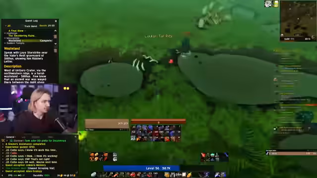 09:15:55Der Streamer nimmt verschiedene Quests in den Burning Steppes an, die für den BRD-Run relevant sind. Er sucht nach Songflowers für World Buffs und stellt fest, dass einige nicht spawnen oder bereits geholt wurden. Die Gruppe diskutiert Quest-Items wie das Symbol of Ragnaros und den Torch of Retribution, die für den Fortschritt essenziell sind. Es gibt Interaktionen mit dem Chat, um die Buffs effizient zu nutzen, und der Streamer betont die Wichtigkeit dieser Vorbereitung für den erfolgreichen Dungeon-Run. Die Probleme mit Quest-Spawn-Timings werden als Hindernis genannt, das gemeinsam gelöst werden muss.