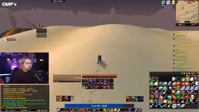 00:08:24Zu Beginn des Streams meldet sich der Streamer nach einer Pause pünktlich im World of Warcraft-Server an, um ein gezieltes Leveln bis Stufe 60 durchzuführen. Nach der Login-Prozedur priorisiert er die Räumung seines überfüllten Inventars, um Platz für Questgegenstände zu schaffen. Er sortiert nutzlos erscheinende Items wie 'Explosive Sheep' aus und sammelt Questrelevante Gegenstände wie 'Core of Elements' und 'Goro Ash' für bevorstehende Aufgaben in Gebieten wie Felwood und Winterspring.