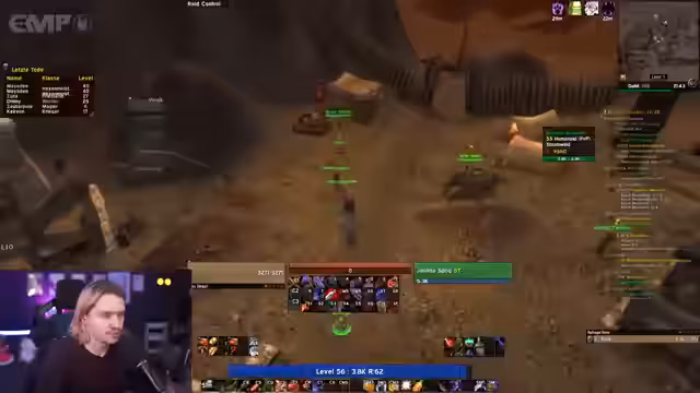 05:08:23Der Streamer berichtet von einem chaotischen Vorfall im Dungeon Deadmines. Zwei Gruppen kämpfen um den selben Named Mob für eine Quest. Die eine Gruppe pullt zu viele Gegner, was zu einem Wipe führt. Aus diesem Grund rennen die überlebenden Mitglieder der anderen Gruppe in den Dungeon, was von der des Streamers fälschlicherweise als gezieltes Griefing interpretiert wird. Es kommt zu Missverständnissen und einer unkoordinierten Flucht. Der Streamer analysiert die Szene und kommt zu dem Schluss, dass es sich eher um einen Unfall als um einen absichtlichen Angriff handelte.