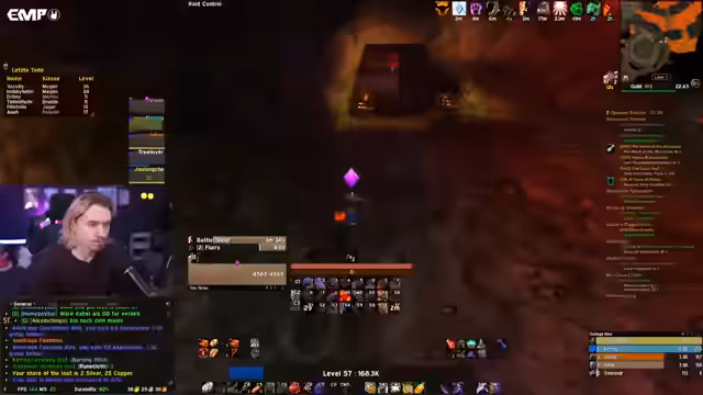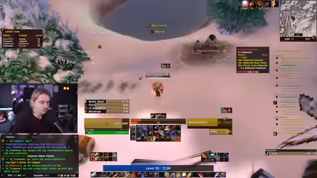 06:51:54Der Streamer, alias Negura, gibt ein Recap der Sauerkraut-Community. Jen-Yan hat Level 38 erreicht und hatte Spaß an einer Goldshire-Party. Es gab leider Todesfälle, u.a. ein Level-54-Tod von Kevin in BRD durch Feuer-Elementare. Die Gruppe erhielt nach dem Tod viel Hate, was den Streamer traurig stimmt, da es unfair ist, da das alles schnell passierte. Die Level-60-Gruppe hatte einen engen Kampf in Scholomance überlebt. Es wurde ein Treffen der Gildenleitung abgehalten und die Möglichkeit eines Molten-Core-LAN-Events für 40 Leute angedeutet.
