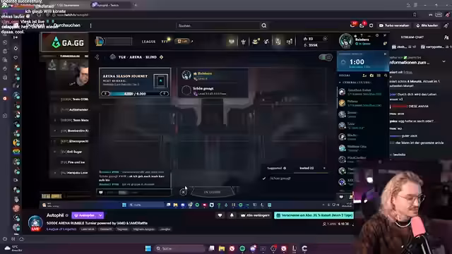 00:13:12Der Streamer stellt das League of Legends Arena-Turnier vor, bei dem er mit Willy Bonkers als Team 'Alaskalax' antritt. Das Turnier hat ein Preisgeld von 5000 Euro und wird heute und möglicherweise morgen gespielt. Er erklärt den Turnieraufbau und das System, bei dem Bonuspunkte nach dem Rang der Spieler in der Solo-Queue vergeben werden. Sein Team ist in der letzten Gruppe, die wahrscheinlich nach 19 Uhr startet. Sein Champion-Pool wird als sehr begrenzt beschrieben, wobei Wei sein bester Champion ist.