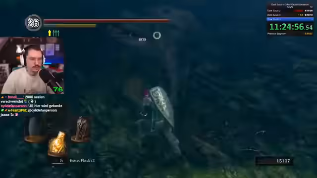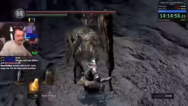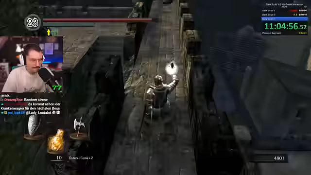05:02:58Nachdem alle Lords of besiegt sind, steht der finale Bosskampf gegen Gwyn, den Lord der Asche, bevor. Dies ist der Höhepunkt des Streams und der No-Death-Challenge. Der Kampf erfordert präzises Parieren und bleibt trotz Erfahrung sehr aufwändig. Leider kommt es während des Kampfes zu einem tödlichen Fehler, was den No-Death-Run beendet, aber das gesamte Vorhaben, Dark Souls 1, 2 und 3 ohne Tod zu absolvieren, bleibt bestehen.