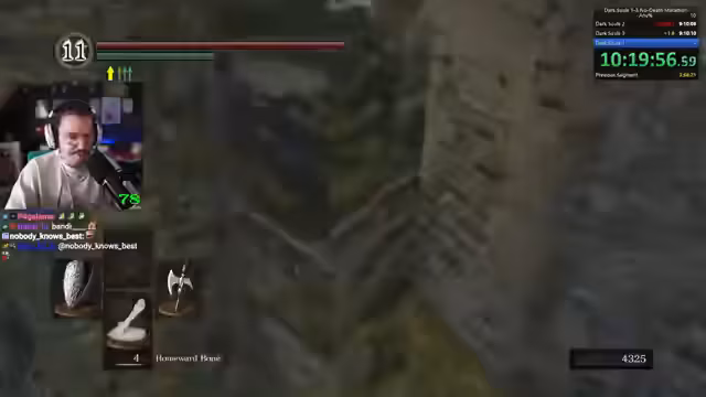 00:09:34Der Streamer beginnt seinen zehnten Versuch der No-Death-Challenge in Dark Souls 1. Nach erfolgreichen Durchgängen von Dark Souls 2 und 3 ist dies das finale Spiel. Er startet mit einem regulären Bandit-Charakter anstelle seines gewohnten Gravelord-Sword-Starts, was ihm unsicher vorkommt, da er diese Route lange nicht gespielt hat. Zuerst sammelt er Seelen und Items, um seine Hellebarde zu upgraden und sich ein stabiles Fundament für den Run zu schaffen. Dabei wird er von einem ungewöhnlich geduldigen Black Knight auf dem Weg zum Taurus-Demon überrascht.