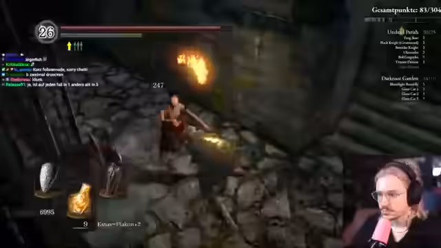 02:17:16Es werden zwei Gegner gepullt, aber das ist okay. Es wird gesagt, dass die Fackelattacke sehr viel Schaden macht. Der Streamer legt eine Humanity zum Heilen rein. Es wird erwähnt, dass gleich einer runterfallen müsste. Der Stray Demon wird mit Fastroll gespielt. Der Streamer heilt sich mit Humanity hoch und knüppelt auf den Stray Demon drauf. Es wird gesagt, dass der Stray Demon Blutung hat. Der Streamer trifft den Stray Demon nicht. Der Stray Demon fliegt und macht seinen Stamm war gar nicht die ganze Zeit. Irgendwann Proc-Blutung und der Stray Demon wird besiegt. Der Streamer sagt, dass der Stray Demon aussieht wie das Teufelchen aus Black and White und erwachsen. Es wird erwähnt, dass es gar nicht lange gedauert hat. Der Streamer fragt, wie viel Damage die Black Knights machen und hofft, sie einfach ordentlich zu parieren. Der Streamer bekommt alle Black Knight Waffen in dem Run. Der Streamer hat seinen ersten Run mit der Heliabade gemacht. Der Streamer besiegt einen Black Knight und klaut Oskars Rüstung. Der Streamer holt sich den Verrosteten Eisenring und will sich mit der Homeward-Bone rausporten, muss aber noch bei Snuggly traden. Der Streamer fällt nicht in das Loch vom Demon und drückt nicht auf Backstep beim Traden.