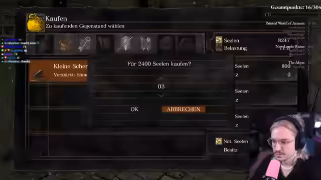 01:32:48Es wird vorsichtig agiert, besonders im Umgang mit Gegnern wie dem Boulder Knight, dessen Parierfähigkeiten und hoher Schaden gefürchtet werden. Es wird überlegt, Brandbomben einzusetzen oder abzuwarten, bis bestimmte Buffs der Gegner verschwinden. Die Angst vor bestimmten Gegnertypen wird offen thematisiert, was sich in jedem Run zu wiederholen scheint. Nach dem Entfachen eines Lagerfeuers wird die erhöhte Anzahl an Estosflaschen erwähnt. Es folgt das Anziehen von besserer Ausrüstung für mehr Sicherheit. Der Streamer plant, den FAP-Ring zu holen, was einen Dialog mit einem NPC erfordert. Menschlichkeit wird eingesetzt, um Item-Find zu erhöhen und Resistenzen zu verbessern. Der Aufzug wird genutzt, um zur Feuerhüterin zu gelangen und die Feuerhüterseele einzutauschen. Der Schlüssel zum Asylum wird erwähnt, und ein Dank geht an Philipp Mac für einen Raid. Es wird überlegt, mehr Vitalität zu investieren, gefolgt von einem Sprung für Bonuspunkte.