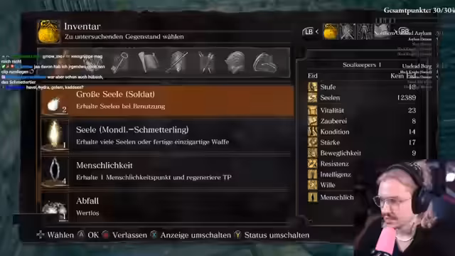 01:43:07Nachdem wichtige Gegenstände gesammelt wurden, bereitet sich der Streamer nun auf den Kampf gegen den Mondfalter vor. Dazu gehört, die Waffe auf plus 5 zu upgraden und die Rüstung so anzupassen, dass die Belastung im Midroll-Bereich bleibt. Es werden auch die Quest von Siegmeyer vorbereitet, die mehrere Gespräche mit dem Charakter erfordert, und die Route zur Entdeckung weiterer Seelen, um stärker zu werden, geplant.