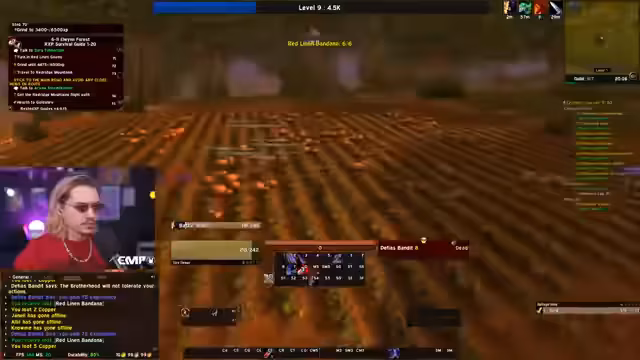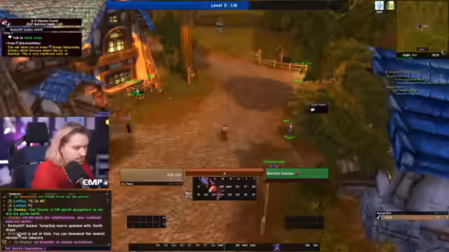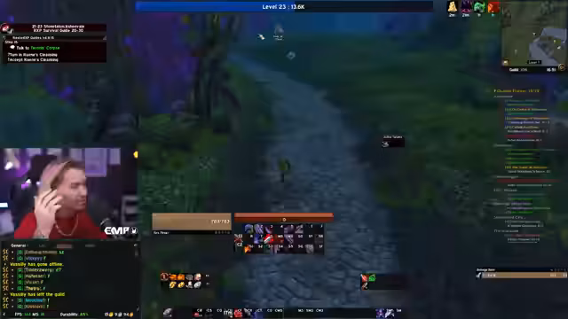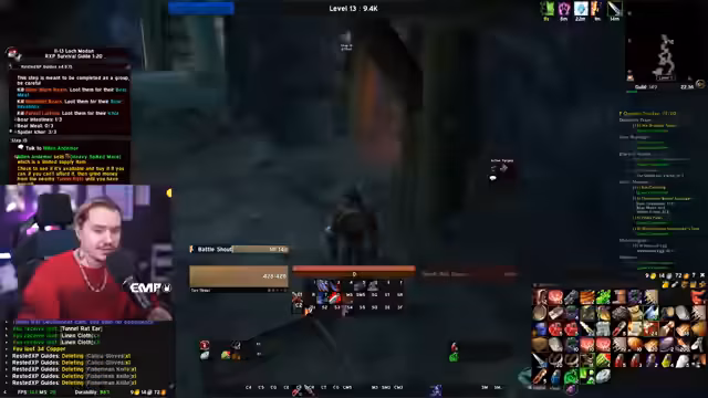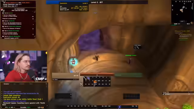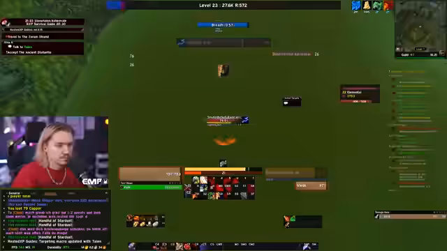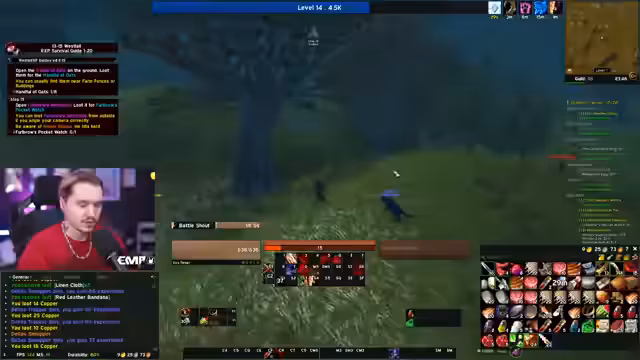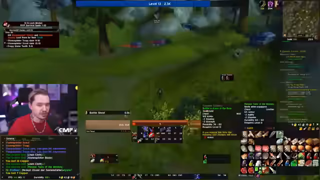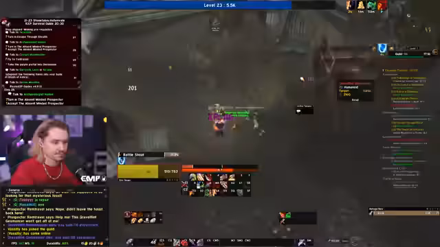 05:10:30Nachdem Level 10 erreicht wurde, wechselt der Fokus auf die Gildenbank und die Kooperation mit anderen Spielern. Ein Gildenmitglied namens Maoki stellt wertvolle Gegenstände wie einen Helm zur Verfügung, die das Leveling beschleunigen. Gleichzeitig plant der Streamer, mit einem anderen Spieler, Linda, in Dungeons zu gehen. Es wird eine Neugestaltung der ActionBar vorgenommen und die weitere Route, einschließlich der Annahme von Quests in Westfall, wird besprochen, wobei ein Fehler beim Holen des Flugpunktes in Sturmwind erwähnt wird.
