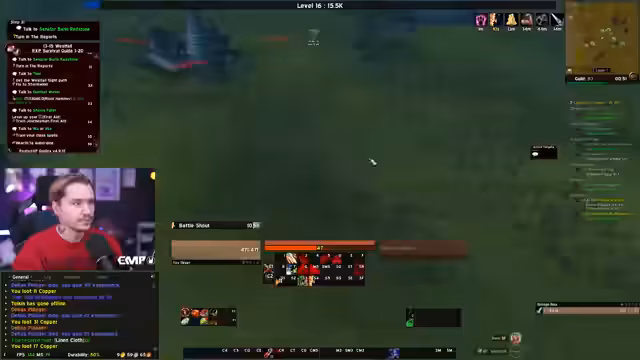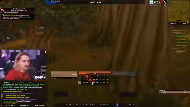 03:11:41Der Fokus verschiebt sich auf die Koordination mit anderen Spielern. Nach dem Verlust seines Charakters sucht er aktiv nach Hilfe für einen neuen Charakter, um World Buffs in Booty Bay zu erhalten. Er bittet Chatmitglieder um die Organisation von Schleifsteinen und Portalen. Gleichzeitig plant er, mit anderen Spielern in die Instanz LBRS (Blackrock Spire) einzusteigen, was seine Integration in die Gilden- und Community-Struktur zeigt.