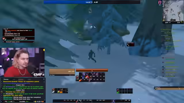 00:02:07Der Stream beginnt mit Begrüßungen und dem Fokus auf World of Warcraft. Der Streamer kommentiert einen lustigen Clip von Metashi, der bei einem Yeti einen Fehler macht und stattdessen im Kreis läuft. Es wird das Gameplay mit Baso und Linda im Rotkamp-Tal erwähnt, die auf Level 25 sind. Der Streamer plant, mit ihnen zusammen zu leveln und bereitet sich vor, indem er Ingenieursfertigkeiten und benötigte Materialien besorgt.