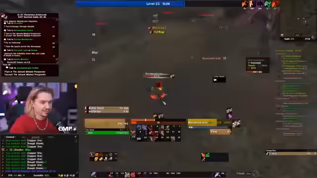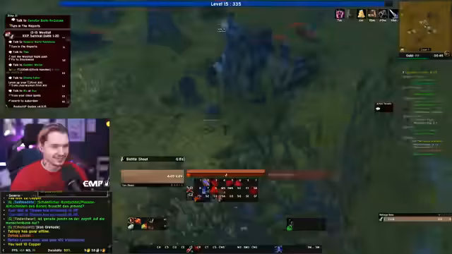 04:17:38Der Streamer erkundet die Jasper Load Mine ohne Tränke, was das Risiko erhöht. Er erlebt einen sehr gefährlichen Moment mit dem Bossgegner Princess, der durch einen Bug einen starken Ladungsangriff ausführen kann, der die Hälfte seiner Lebenspunkte auf einmal vernichtet. Es wird ein sogenannter Close Call beschrieben, bei dem der Streamer knapp dem Tod entgeht. Nachdem er den Boss besiegt hat, geht es zurück ins Startgebiet, um gemeinsam mit anderen Spielern, wie einem Gucci Warrior namens Ginny, weiter zu leveln und eine Dungeon-Sitzung zu planen.
