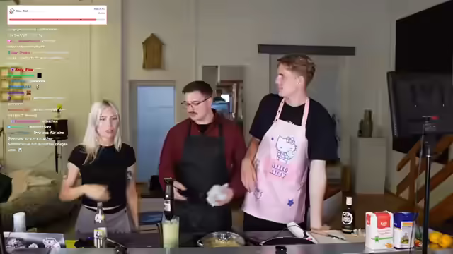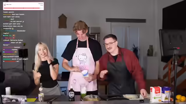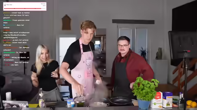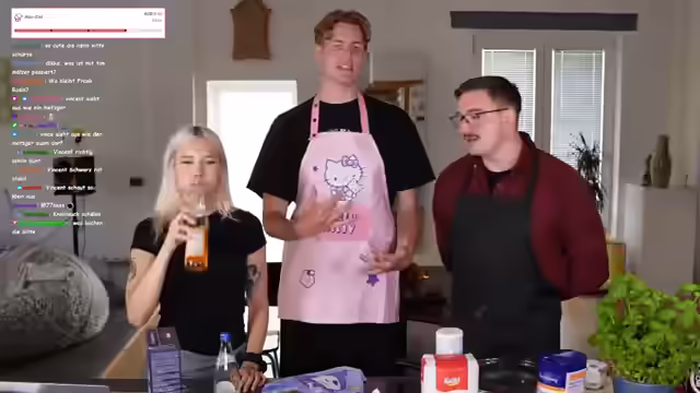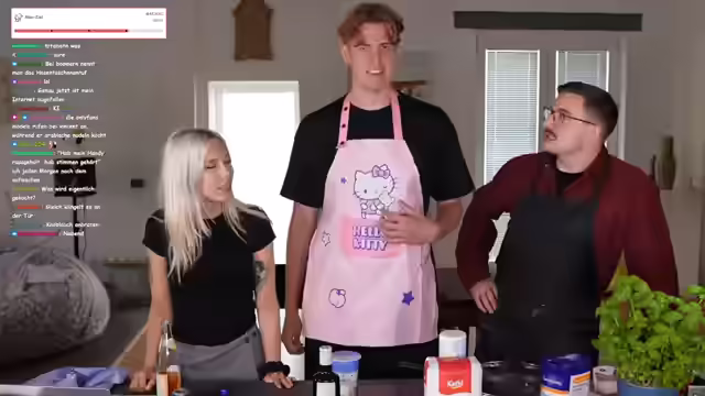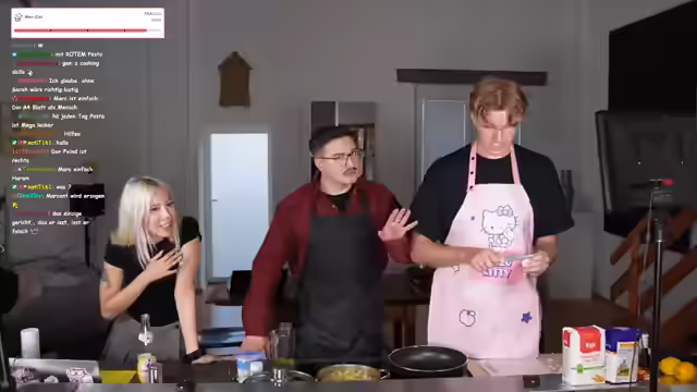 Humorvolle Diskussionen über das Miauen für Subs und Rufverlust, Größenvergleiche und der Beginn des Kochens trotz Internetausfalls prägen den Abend. Eine Schürzen-Debatte, das Schneiden von Mangos und unterschiedliche Meinungen über Nudeln führen zu einem unerwarteten Videoanruf. Zutaten für Soße werden bekannt gegeben und mit Schnick-Schnack-Schnuck wird entschieden, wer den Knoblauch schneidet. Es folgt ein kulinarisches Experiment mit Erbsen, Feta und Pinienkernen, gefolgt von freundschaftlichen Neckereien und Erinnerungen.