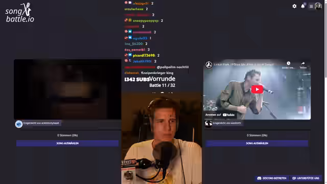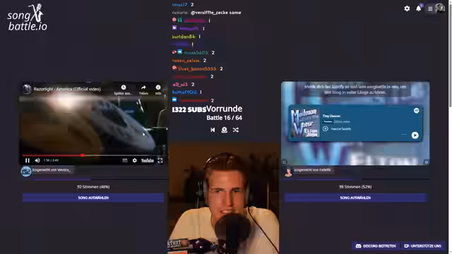 03:05:00Es wird ein Song Battle angekündigt, bei dem die Zuschauer ihre All-Time-Lieblingssongs auf YouTube oder Spotify suchen und den Link kopieren sollen. Nicht alle Einsendungen können berücksichtigt werden, daher ist Schnelligkeit gefragt. Der Ablauf des Song Battles wird erklärt: Jeweils zwei Songs werden etwa 30 Sekunden angespielt, und die Zuschauer können per Chat-Nachricht (1 für den linken, 2 für den rechten Song) abstimmen, welcher Song ihnen besser gefällt. Durch dieses Verfahren soll der beste Song der Welt ermittelt werden. Es gibt technische Probleme bei der ersten Abstimmung, die daraufhin wiederholt wird. Es werden verschiedene Songs gegeneinander antreten lassen, darunter Lisa gegen einen unbekannten Song, Billy Joel gegen Hotel California und ABBA gegen Insomnia. Der Chat entscheidet durch Abstimmung, welche Songs in die nächste Runde einziehen. Es wird festgestellt, dass der Chat nicht immer den besten Musikgeschmack beweist, aber die Entscheidung des Chats wird akzeptiert.