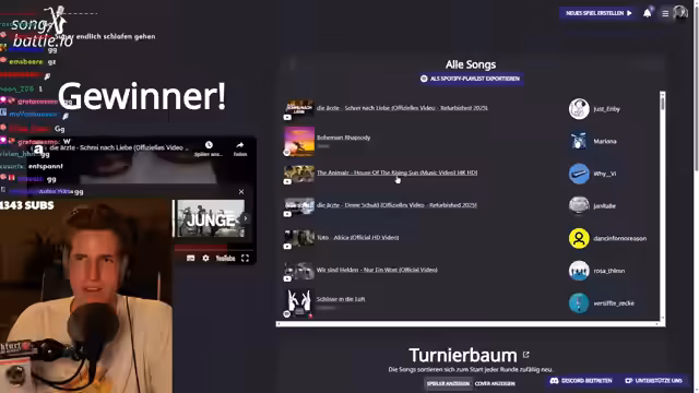 05:30:00Das Viertelfinale des Song Battles wird erreicht, und die verbleibenden Songs treten gegeneinander an. Die Abstimmungen werden enger und jede Stimme zählt. Es kommt zu einem vorgezogenen Finale zwischen Die Ärzte und House of the Rising Sun. Im Halbfinale stehen sich Die Ärzte und Bohemian Rhapsody gegenüber. Das Finale bestreiten Mariana und Just Envy, wobei Just Envy zum Sieger gekürt wird. Jan Ralle und Marianne belegen die Plätze 3 und 2. Der Streamer lobt den guten Musikgeschmack der Community und bedankt sich für die Teilnahme. Er erwähnt, dass er Feature-Angebote bekommen hat, sich aber noch nicht bereit dafür fühlt. Zum Abschluss bedankt er sich für die Subs, Bits und Nachrichten und verabschiedet sich von den Zuschauern.