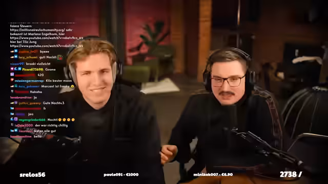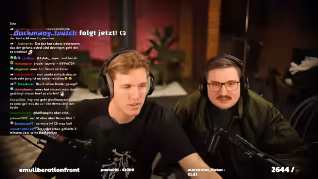 00:01:58Es bricht ein Streit zwischen den beiden Streamern aus, der aus einem vorherigen Beef resultiert. Gastgeber Marc wirft seinem Vorwurf vor, mit ihm zu streamen, und bezeichnet ihn als 'Volksverräter' und 'linksgrüne Zecke'. Beide einigen sich darauf, den Streit beizulegen und gemeinsame Inhalte zu produzieren, was eine Einladung in den jeweils anderen Chat vorsieht. Die Stimmung ist angespannt, soll aber für die weitere Show entschärft werden.