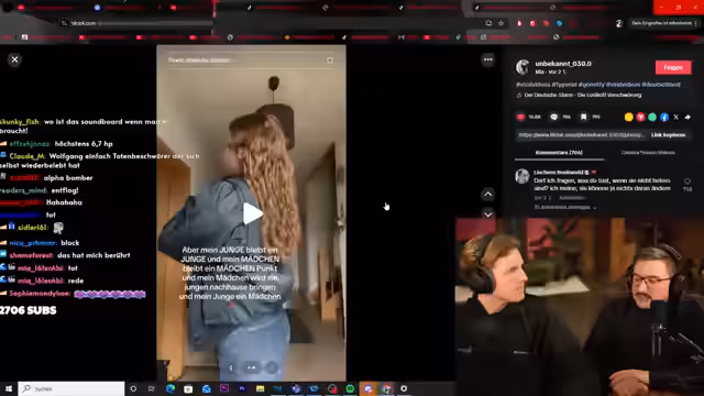 01:49:38Der Streamer analysiert mehrere rechte TikTok-Accounts, darunter "Jörg Sprawe", einem sogenannten Waffenexperten, und "Stella", eine bekannte Figur der rechten Szene. Es werden ihr Verhalten, ihr Umfeld und ihr Auftritt kritisch beleuchtet. Der Streamer äußert sich besorgt über ihre fehlende Perspektive und die Gefahr, in der sie schwebt, während er gleichzeitig deren Inhalte und Handlungen verspottet.
